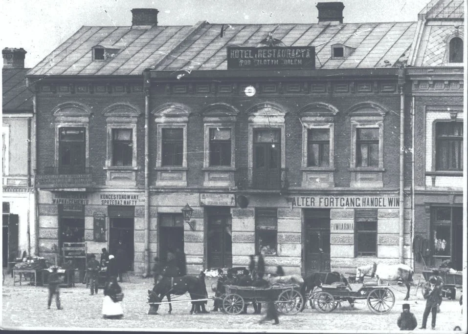 Nr 21. Przed rokiem 1850 stała tu druga z czterech murowanych kamienic przy Rynku. Po 1900 r. w obecnej eklektycznej kamienicy mieścił się hotel Altera Fortganga "Pod złotym orłem". Przewodnik Orłowicza podaje, że ceny hoteli w Mielcu wynosiły od 1,60 do 2,50 korony (w Tarnowie od 2 do 6 koron, w Jaśle od 1,60 do 6 koron, we Lwowie od 2,40 do 11 koron). Dorożka z dworca do hotelu 110 lat temu kosztowała 60-70 halerzy (w Tarnowie 1 koronę, w Jaśle 0,80 do 1 korony, we Lwowie od 1,20 korony w górę). Parter kamienicy zajmowała piwiarnia i "Handel win". Córka właściciela hotelu – Estera Fortgang zginęła wraz z mężem w tarnowskim getcie w 1942 r. Piwiarnia w dwudziestoleciu międzywojennym ewoluowała do nieco bardziej ekskluzywnego lokalu gastronomicznego, w którym w roku 1941 dał koncert Mordechaj Gebirtig (1877-1942), krakowski poeta i pieśniarz tworzący w jidysz. Zaśpiewał wówczas m.in. swój słynny utwór "Mayn sztetl s`brent" (Moje miasteczko płonie).