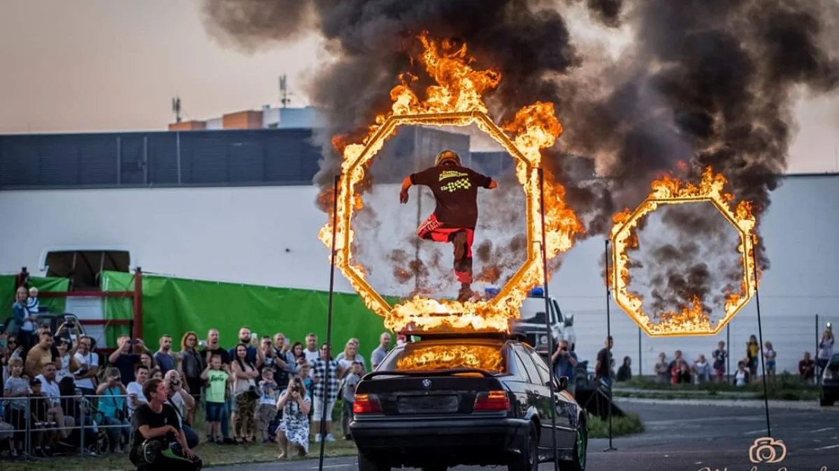 -przejazdy przez ścianę ognia z człowiekiem na masce,