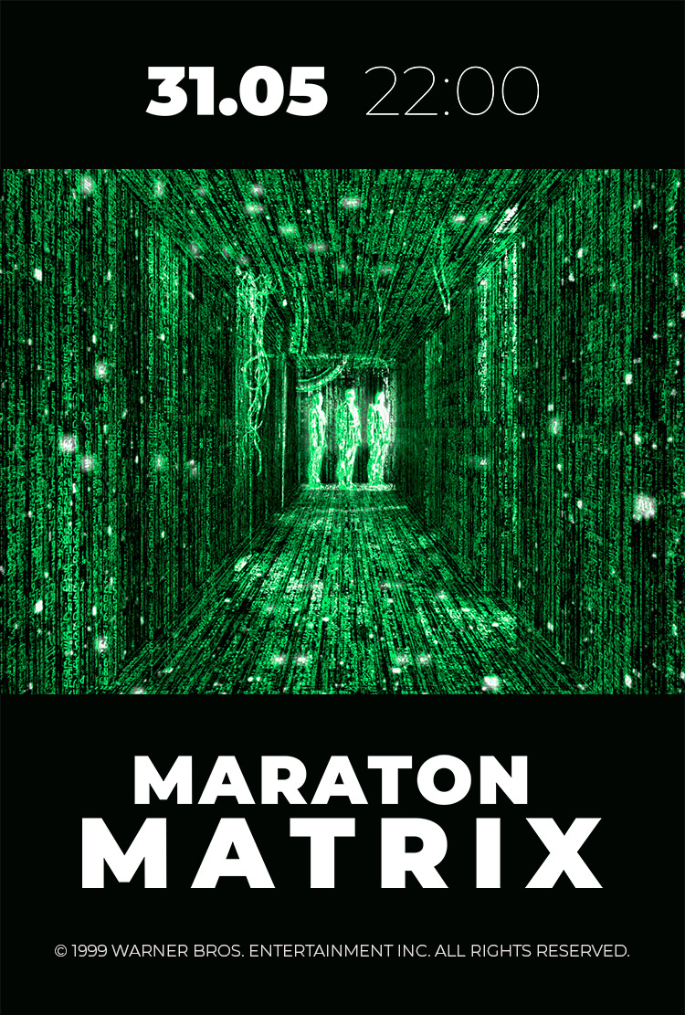 Wirtualny świat Matrixa powraca na kinowe ekrany. 20 lat po premierze pierwszej części trylogii, zapraszamy na Maraton Matrix, niesamowitą noc z kultowymi bohaterami i kultowymi efektami specjalnymi, które wyznaczyły drogę współczesnego kina science fiction. 31 maja startujemy już o godz. 22:00