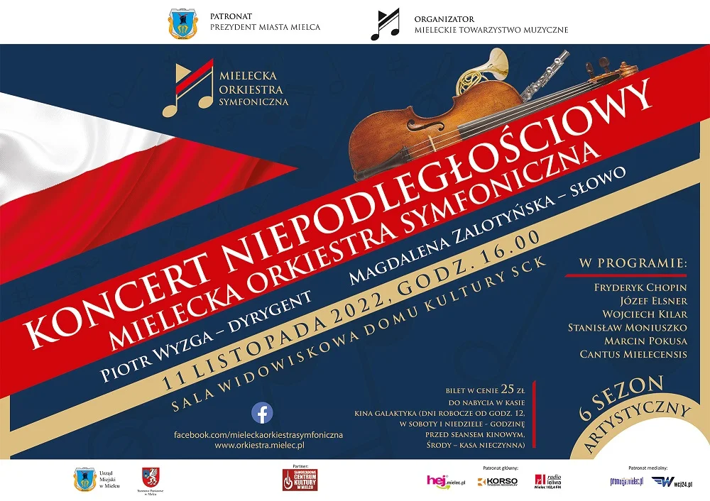 Mielecka Orkiestra Symfoniczna 11 listopada, tradycyjnie już, oddaje artystyczny hołd najważniejszemu w dziejach naszego kraju wydarzeniu. Koncert Niepodległościowy MOS będzie prezentacją dzieł wybitnych kompozytorów polskich. Niezmiennie istotną konwencję lokalną wydarzenia zaakcentuje prawykonanie „Rapsodii Żywieckiej”, której autorem jest związany z Mielcem i MOS Marcin Pokusa. W programie znajdą się utwory: Fryderyka Chopina, Józefa Elsnera, Wojciecha Kilara, Stanisława Moniuszki.