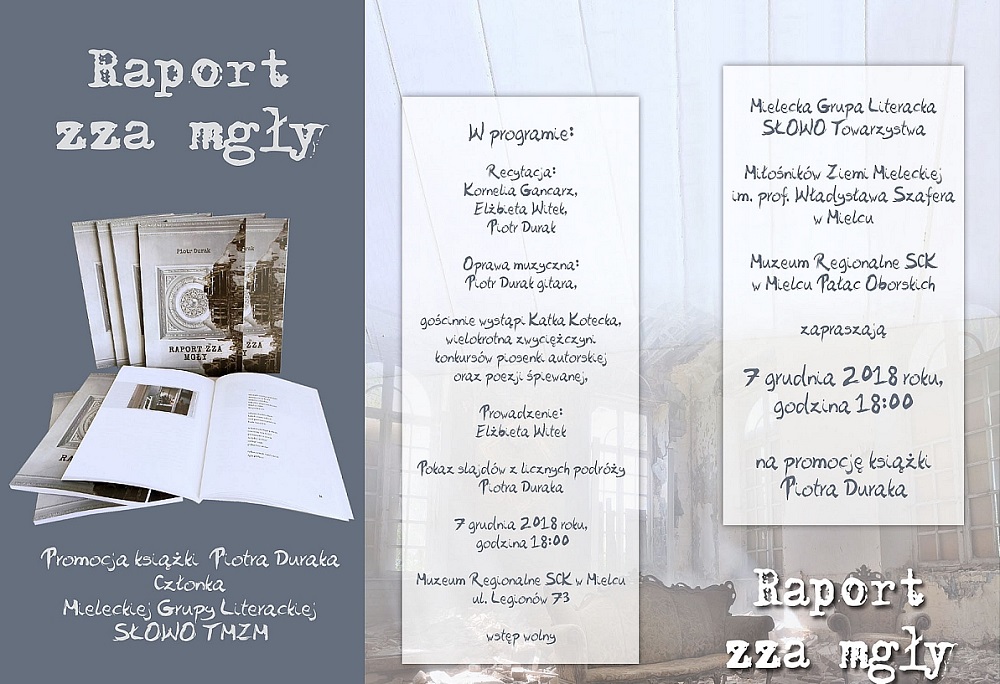 Oprócz spotkania z wybitnie utalentowanym pisarzem, podróżnikiem i fotografikiem, jedną z głównych atrakcji wieczoru będzie mini recital niezwykłej piosenkarki o aksamitnym głosie i gitarzystki Katki Koteckiej znanej i uznanej w kraju oraz w Europie. Będzie to poetycki wieczór pełen refleksji o współczesnym świecie, miłości i przemijaniu. Kolejną atrakcją wieczoru będzie pokaz zdjęć Piotra Duraka z miejsc opuszczonych przez człowieka.