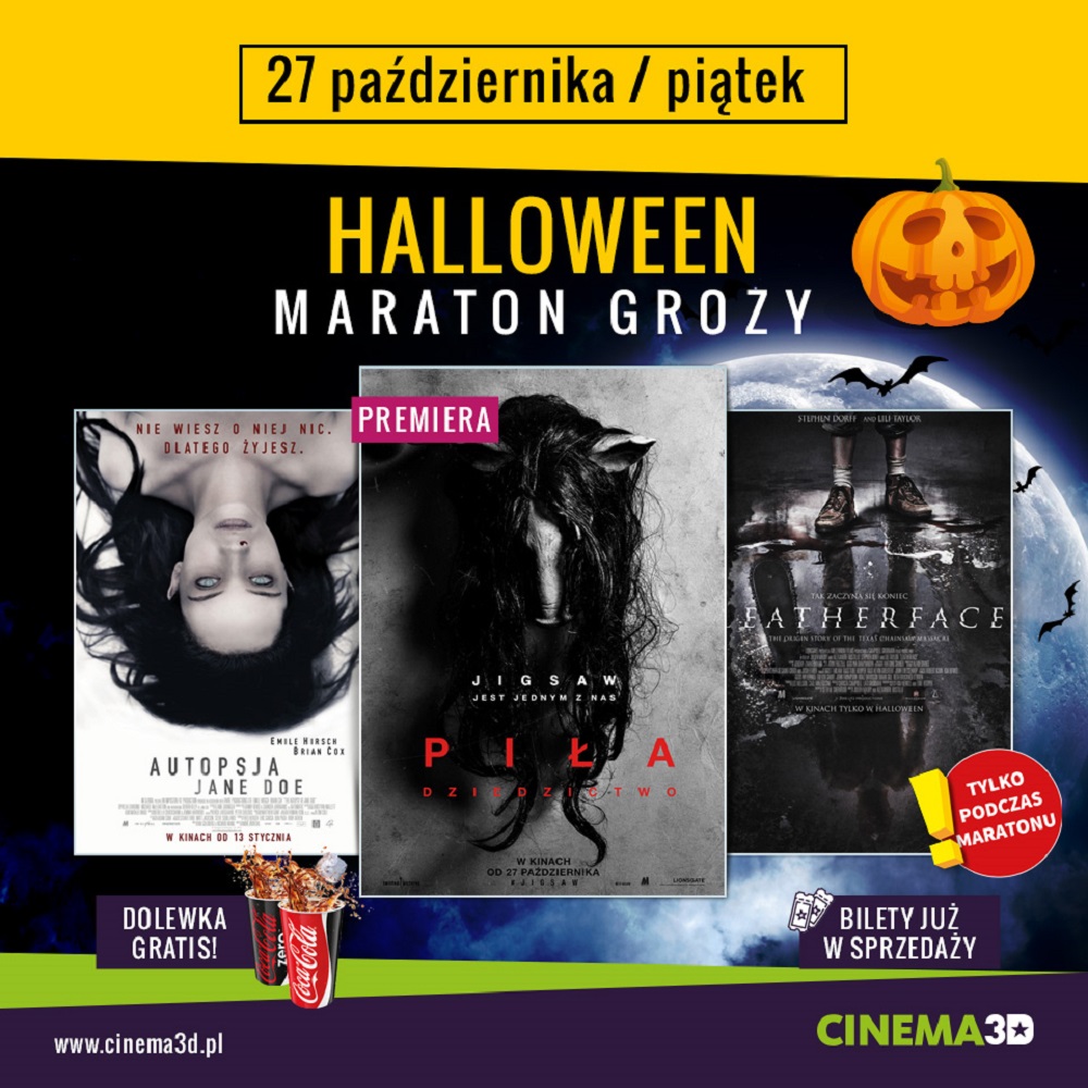 Halloween Maraton Grozy to wydarzenie, które już 27 października zawładnie umysłami widzów. Punktualnie o godzinie 22: 00, rozpocznie się impreza, kierowana wyłącznie do widzów o mocnych nerwach. Tej nocy we wszystkich kinach CINEMA3D w ciągu niespełna sześciu godzin, widzowie zobaczą trzy naprawdę mrożące krew w żyłach filmy.