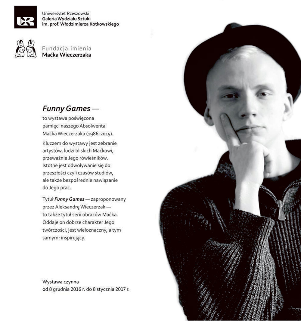 Kilkunastu znanych artystów prezentuje swoje prace na wystawie Funny Games, poświęconej pamięci Macieja Wieczerzaka. Wystawa znajduje się na Wydziale Sztuki Uniwersytetu Rzeszowskiego, rodzimej uczelni mieleckiego artysty, który dokładnie rok temu zmarł, przegrywając walkę z ciężką chorobą nowotworową.