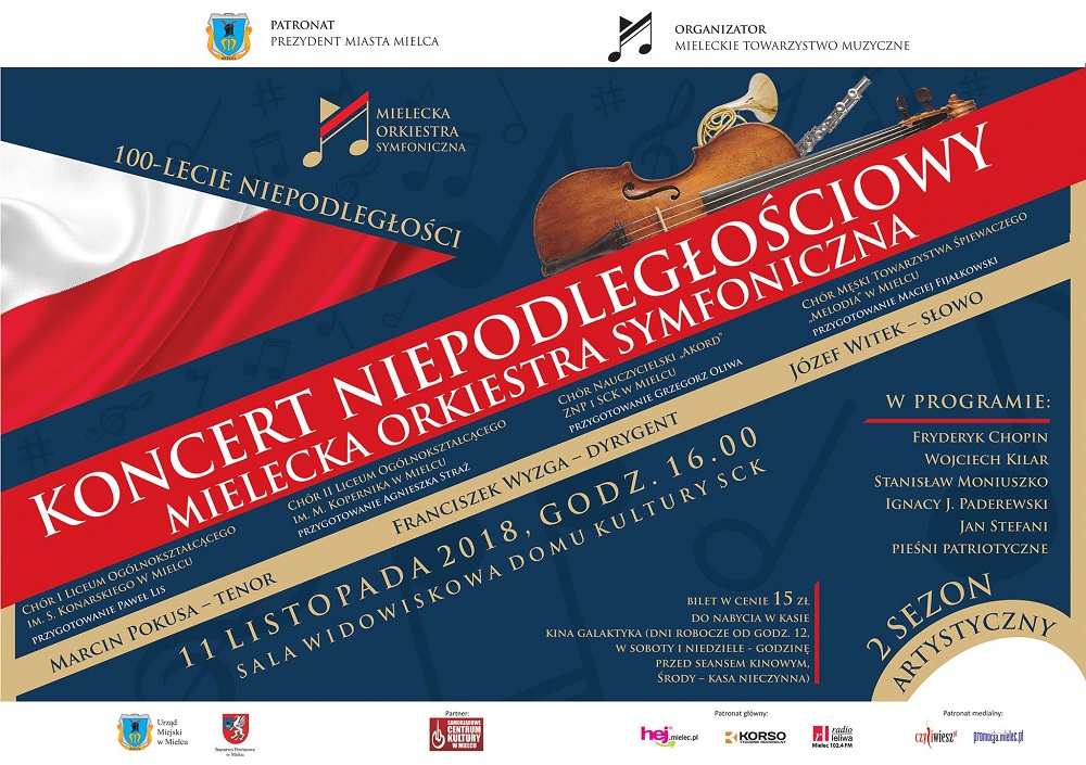 Mielecka Orkiestra Symfoniczna pod dyrekcją Franciszka Wyzgi wystąpi z: Chórem I Liceum Ogólnokształcącego im. S. Konarskiego w Mielcu pod kierunkiem Pawła Lisa, Chórem II Liceum Ogólnokształcącego im. M. Kopernika w Mielcu przygotowanym przez Agnieszkę Straż, Chórem Nauczycielskim „Akord” ZNP i SCK w Mielcu pod dyrekcją Grzegorza Oliwy, Chórem Męskim Towarzystwa Śpiewaczego „Melodia” w Mielcu przygotowanym przez Macieja Fijałkowskiego. W programie usłyszymy utwory: Fryderyka Chopina, Wojciecha Kilara, Stanisława Moniuszki, Ignacego J. Paderewskiego, Jana Stefaniego, pieśni patriotyczne.