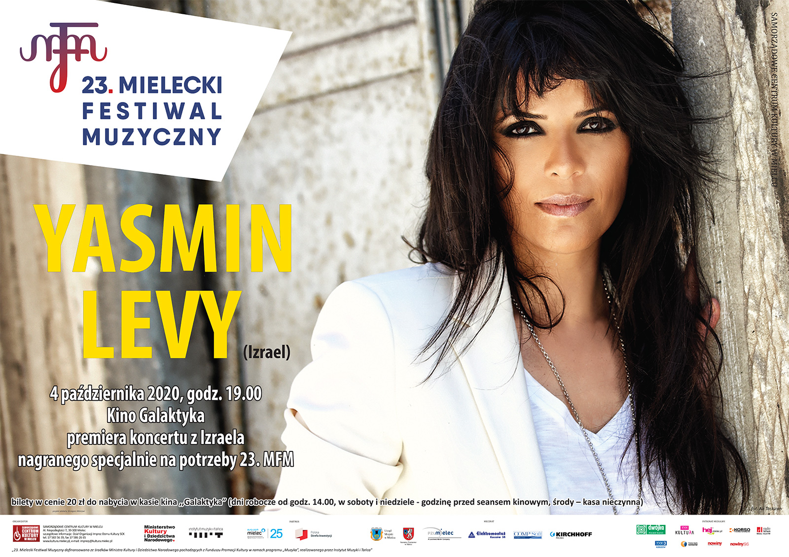 Zwieńczeniem 23. Mieleckiego Festiwalu Muzycznego miał być koncert Yasmin Levi. Artystka cieszy się wielką popularnością na świecie, a o jej koncert w ramach 23. MFM telefonicznie dopytywali się fani artystki, również spoza Mielca. Niestety, wokalistka pochodzi z Izraela, który nie tylko zamknął swoje granice, ale też 18 września, wprowadził zakaz opuszczania miejsca zamieszkania. Tym samym Yasmin Levi nie może opuścić kraju i koncertować w Mielcu. Specjalnie dla publiczności 23. Mieleckiego Festiwalu Muzycznego artystka - wraz z zespołem swoich muzyków - nagrała w Izraelu te utwory, które miała wykonać w Mielcu. Ten koncert będzie retransmitowany w kinie „Galaktyka” DK SCK. Retransmisja odbędzie się 4 października, o godz. 19, a więc w terminie przewidzianym programem 23. MFM. Bilety na retransmisję w cenie 20 zł będzie można kupić w kasie kina „Galaktyka” (dni robocze od godziny 12, w soboty i niedziele – godzinę przed seansem kinowym, w środy – kasa nieczynna).