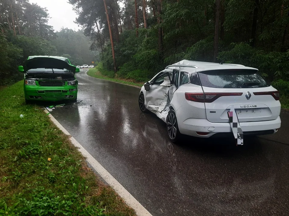 W zdarzeniu drogowym uczestniczyły dwa pojazdy: osobowy renault oraz dostawczy volkswagen. W wyniku zderzerzenia samochodów dwie osoby zostały przewiezione do szpitala.