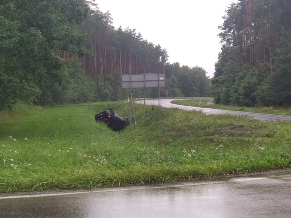 Jak informują policjanci, kierujący osobówką, jadąc od Mielca w kierunku Połańca, na łuku drogi zjechał na drugi pas, potem do rowu. Tu samochód przewrócił się na bok.