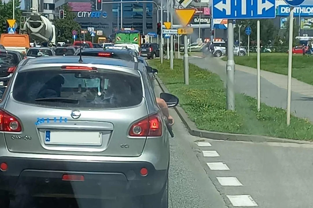 Jeżdżą po Rzeszowie i celują bronią do ludzi i innych aut. W aucie 4 osoby, każda z nich mniej więcej po 20 lat, osoba z bronią miała okulary i całą prawą rękę wytatuowaną albo popisaną markerem