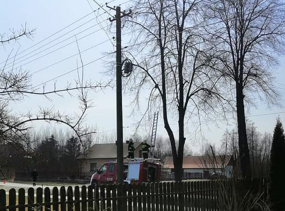 Strażacy ochotnicy z Izbisk ściągnęli kota, który utknął wysoko na drzewie.