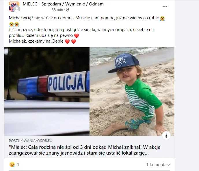 "Mielec. Cała rodzina nie śpi od 3 dni odkąd Michał zniknął... W akcję zaangażował się znany jasnowidz i stara się ustalić lokalizację". Taka wiadomość pojawiła się dziś na mieleckich grupach na portalach społecznościowych. Nie jest to pierwszy raz, kiedy oszuści posuwają się tego typu metod, by wyłudzić nasze dane osobowe.