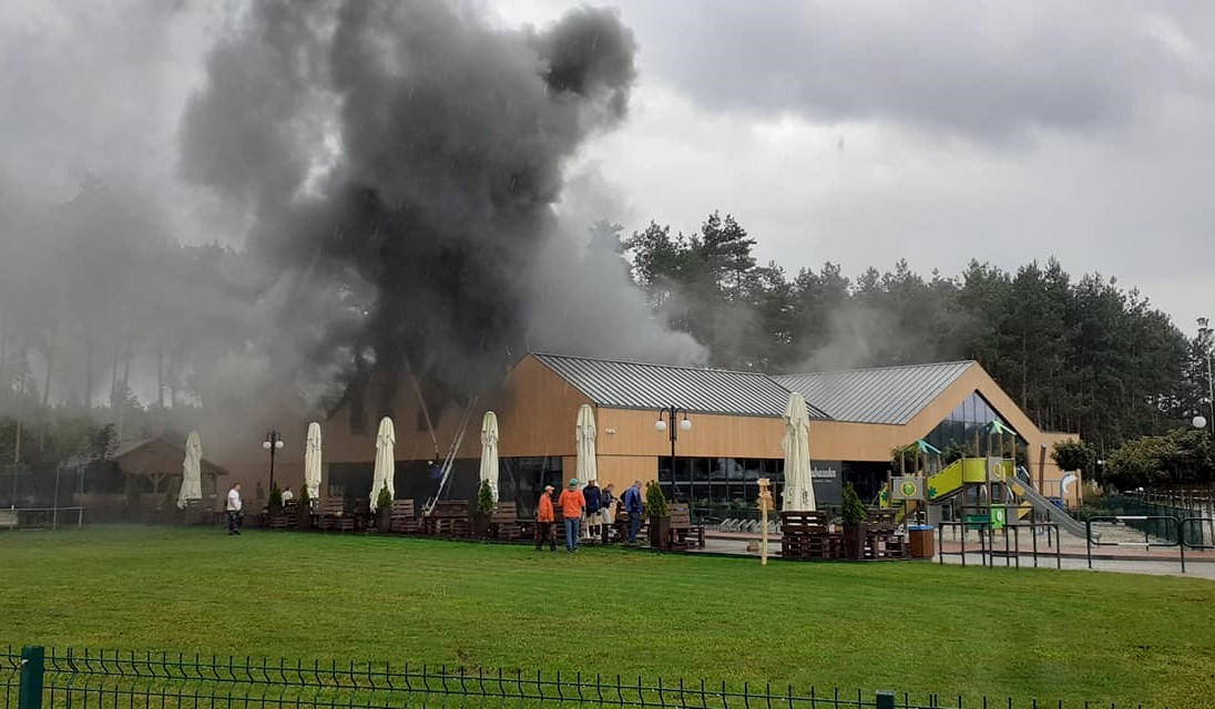 Z dalekiej odległości widać jak z drewnianego obiektu wydobywa się czarny dym.