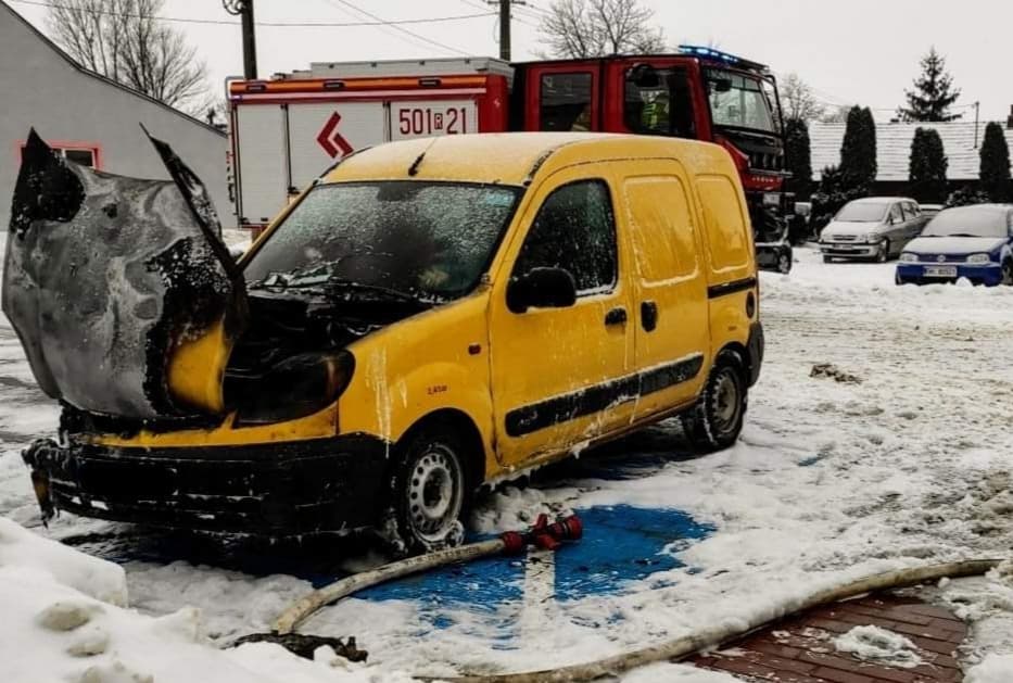 Na parkingu przed sklepem w samych środku miejscowości zapalił się niewielki samochód dostawczy renault kangoo. Strażacy dotarli tam, gdy płomienie już wydostały się z komory silnika ponad maskę pojazdu. Szybka interwencja druhów ocaliła jednak pozostałą część samochodu.
