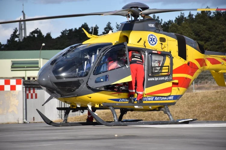 Śmigłowiec przyleciał po pacjentkę mieleckiego szpitala. Załoga pogotowia pomogła w transporcie kobiety na lądowisko.