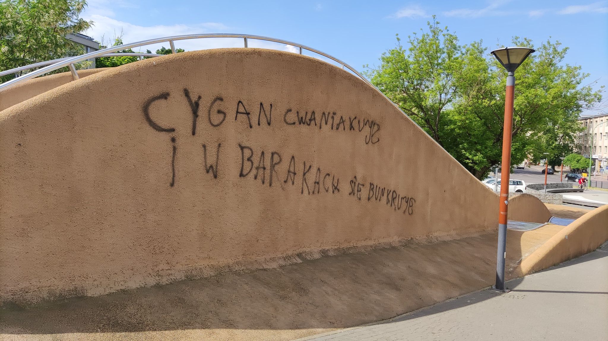 Ściany budynku zostały już pomalowane, jednak "malarz" nie spoczął na dziele weekendowym. Dzisiaj (9 czerwca) przy zjeżdżalniach na Górce Cyranowskiej można zobaczyć kolejny napis namalowany spreyem.