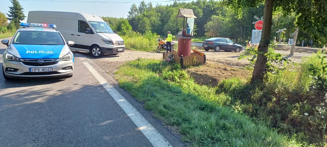 W wypadku poszkodowany został motocyklista. Droga częściowo jest zablokowana. Ruch odbywa się wahadłowo.