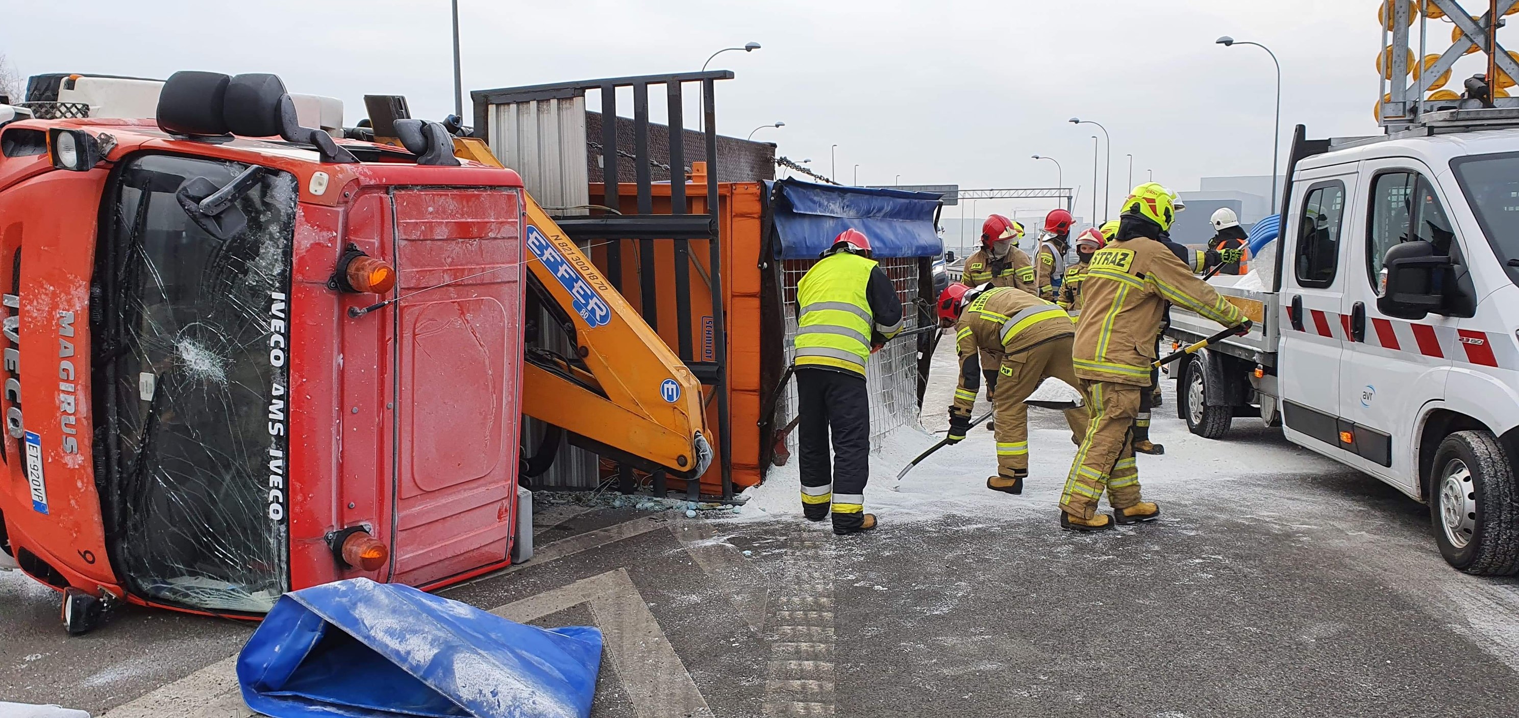 Wywrócona piaskarka na autostradzie!