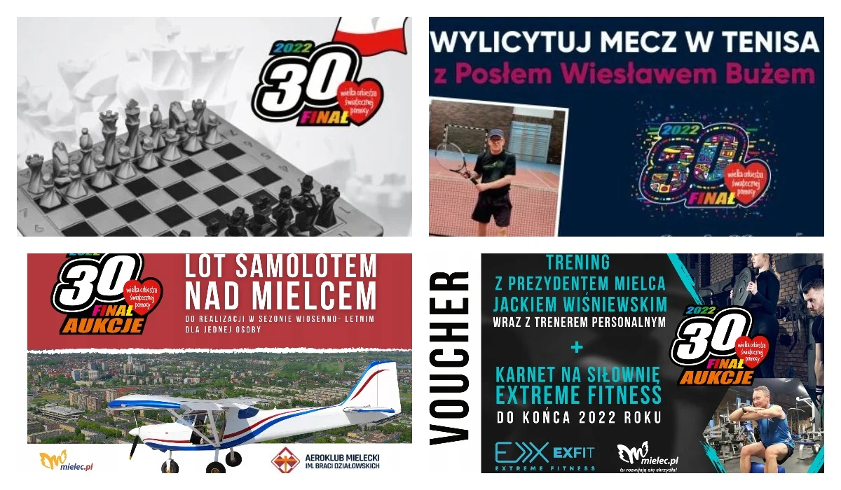 PodkarpacieDo 30. finału Wielkiej Orkiestry Świątecznej Pomocy coraz mniej czasu. Sprawdzamy co możecie zdobyć na licytacjach podkarpackich sztabów, a tam: mecz tenisa z posłem Wiesławem Bużem, niepowtarzalne szachy odlane z aluminium, voucher na lot samolotem nad Mielcem, trening na siłowni z prezydentem Mielca - Jackiem Wiśniewskim, koszulki sportowe i moc atrakcji.
