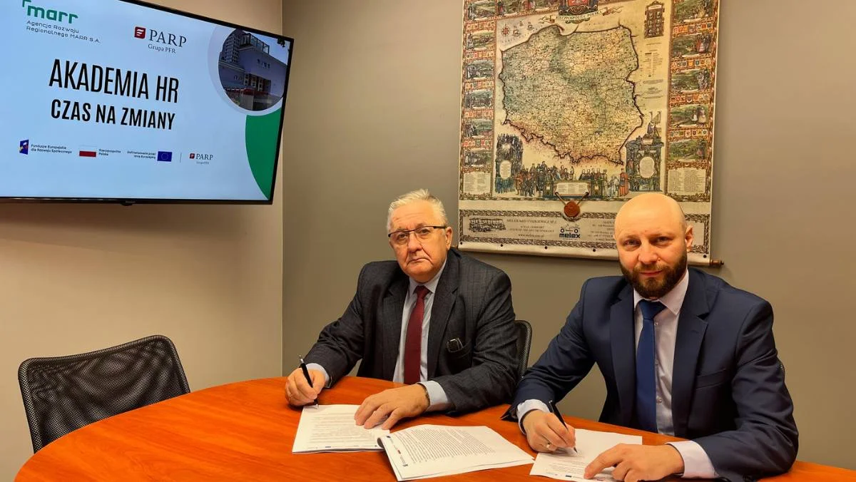 Zarząd Agencji Rozwoju Regionalnego MARR S.A. Prezes Łukasz Gajdowski i Wiceprezes Antoni Górski podpisali z Polską Agencją Rozwoju Przedsiębiorczości S.A. w Warszawie umowę na realizację projektu „Akademia HR – czas na zmiany” współfinansowanego ze środków Europejskiego Funduszu Społecznego Plus w ramach programu Fundusze Europejskie dla Rozwoju Społecznego 2021–2027 (Priorytet I – Umiejętności, Działanie 01.03 Kadry nowoczesnej gospodarki).