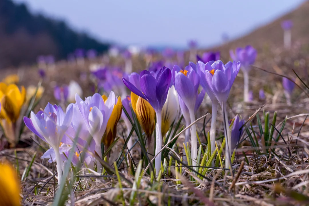 Krokusowe dywany kojarzą się nam przede wszystkim z tatrzańską Doliną Chochołowską i Kalatówkami. Fioletowe, białe a często i żółte kwiaty rosną w kwietniu na tatrzańskich łąkach, ale można jest także spotkać na przykład na szlaku na górę Turbacz w Gorcach oraz na samym szczycie. Jednak najwcześniej, już na przełomie marca i kwietnia, krokusy pojawiają się w Muszynie.