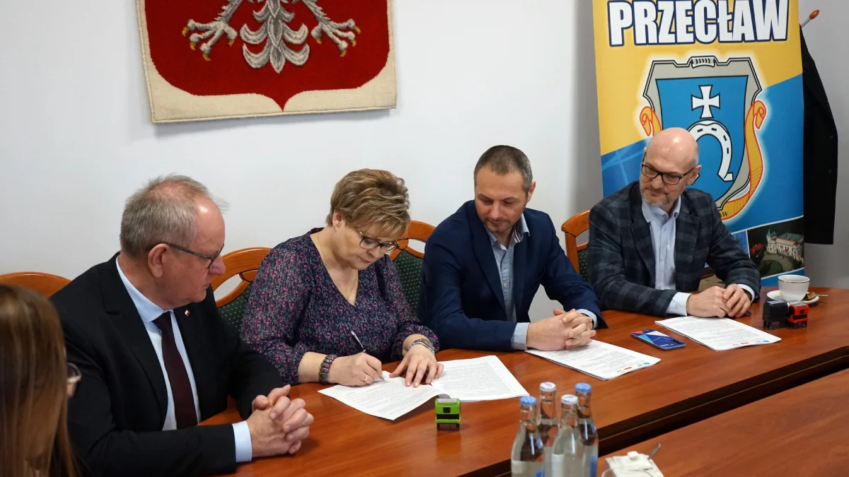 Gmina Przecław rozpoczyna kolejną ważną dla Mieszkańców inwestycję. 12 lutego b.r. Burmistrz Renata Siembab podpisała przy kontrasygnacie Skarbnik Renaty Koszyk umowę z firmą GRUPA KDM Sp. z o. o. z Warszawy na realizację zdania pn. "Rozbudowa i przebudowa budynku SUW wraz z budową zbiorników retencyjnych wody uzdatnionej w Tuszymie".