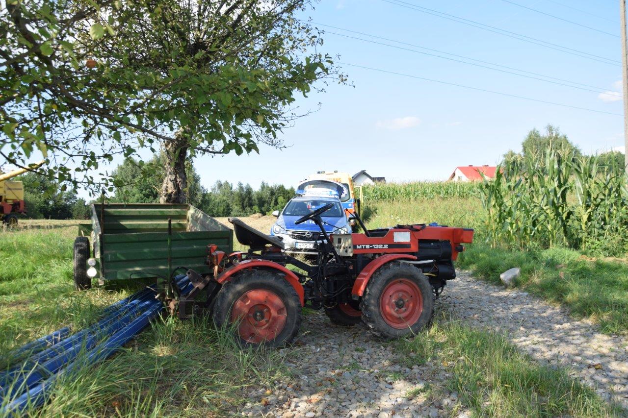 Mężczyzna stracił panowanie nad pojazdem, wypadł z kabiny, po czym jego noga została przejechana przez prawe, przednie koło traktora, który zatrzymał się dopiero na najbliższym drzewie.