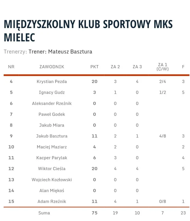 Drużynę reprezentowali w ostatnich dwóch spotkaniach: Krystian Pezda, Ignacy Gudz, Aleksander Rzeźnik, Paweł Godek, Jakub Miara, Jakub Basztura, Maciej Maziarz, Kacper Parylak, Wiktor Cieśla, Wojciech Kozłowski, Alan Miękoś oraz Adam Rzeźnik. Szkoleniowcem zespołu jest natomiast trener Mateusz Basztura.