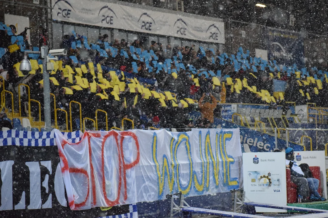 Na trybunach pojawiła się flaga Ukrainy. Zobaczcie zdjęcia kibiców z meczu Stali z Jagiellonią [ZDJĘCIA]