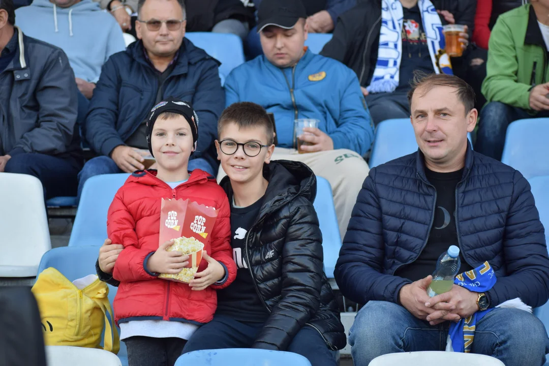Kibice, w barwach Stali, głośno wspierają swój zespół, tworząc niepowtarzalną atmosferę na trybunach.