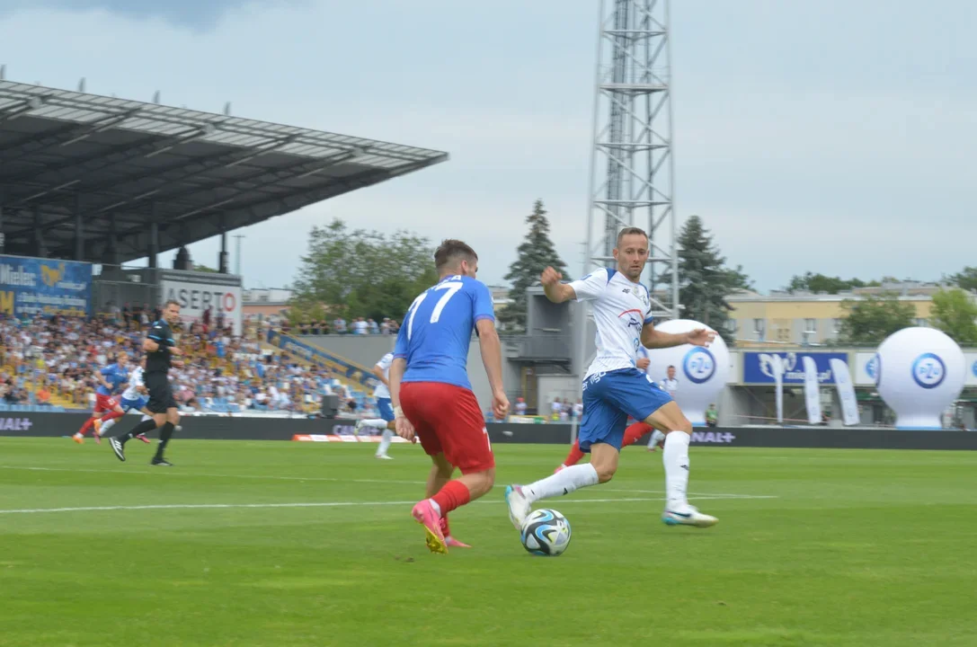 Na boisku nie było żadnych sentymentów. Beniaminek z Niepołomic od pierwszych minut spotkania na stadionie przy Kałuży starał się zaskoczyć Stal. Bardzo aktywny był Cholewiak, który kilka razy szarżował w stronę bramki Mateusza Kochalskiego. Zdecydowanie najgroźniejszą sytuację podopieczni Tułacza mieli w 39 minucie. Mroziński dostał podanie w pole karne od Romana Yakuby i miał możliwość pokonania strzałem z ostrego kąta Kochalskiego. Golkiper Stali był lepszy. Z kolei w szeregach biało-niebieskich brylował Koki Hinokio i dwa jego uderzenia sprawiły, że fani z Niepołomic obawiali się straconych goli. W 19 minucie Japończyk trafił słupek, a w 24 minucie Kewin Komar pokazał swój bramkarski kunszt.
