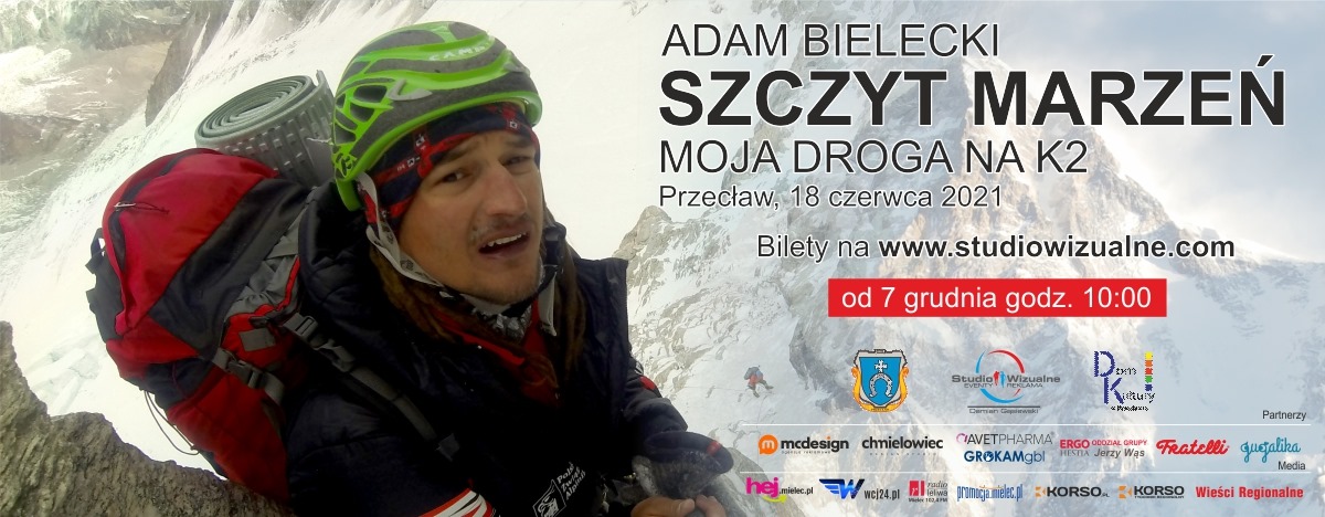 Adam Bielecki – 37 lat. Himalaista, alpinista, taternik i podróżnik. Klub Wysokogórski Kraków. Członek kadry narodowej we wspinaczce wysokogórskiej. Pochodzi z Tychów, mieszka w Wielkopolsce. Absolwent Psychologii UJ. Wspina się w górach od 20 lat. Lider kilkudziesięciu wypraw w różne góry na 5 kontynentach. Zdobywca wyróżnienia w konkursie Kolosy 2000 za dokonanie w wieku siedemnastu lat, najmłodszego, samotnego i w stylu alpejskim wejścia na Khan Tengri, 7010 m. Jesienią 2011 roku zdobył piąty szczyt świata, Makalu, 8463 m. 9 marca 2012 roku wraz z Januszem Gołąbem dokonał pierwszego zimowego wejścia na Gasherbrum I, 8068 m, co zostało uhonorowane Kolosem i nagrodą Travelera National Geographic, a także uznane zostało za największe osiągnięcie w dziedzinie eksploracji w 2012 roku przez prestiżowy portal amerykański explorersweb. Zdobywca K2 (31 lipca 2012 r.) i Broad Peaka – pierwsze zimowe wejście (5 marca 2013 r.).