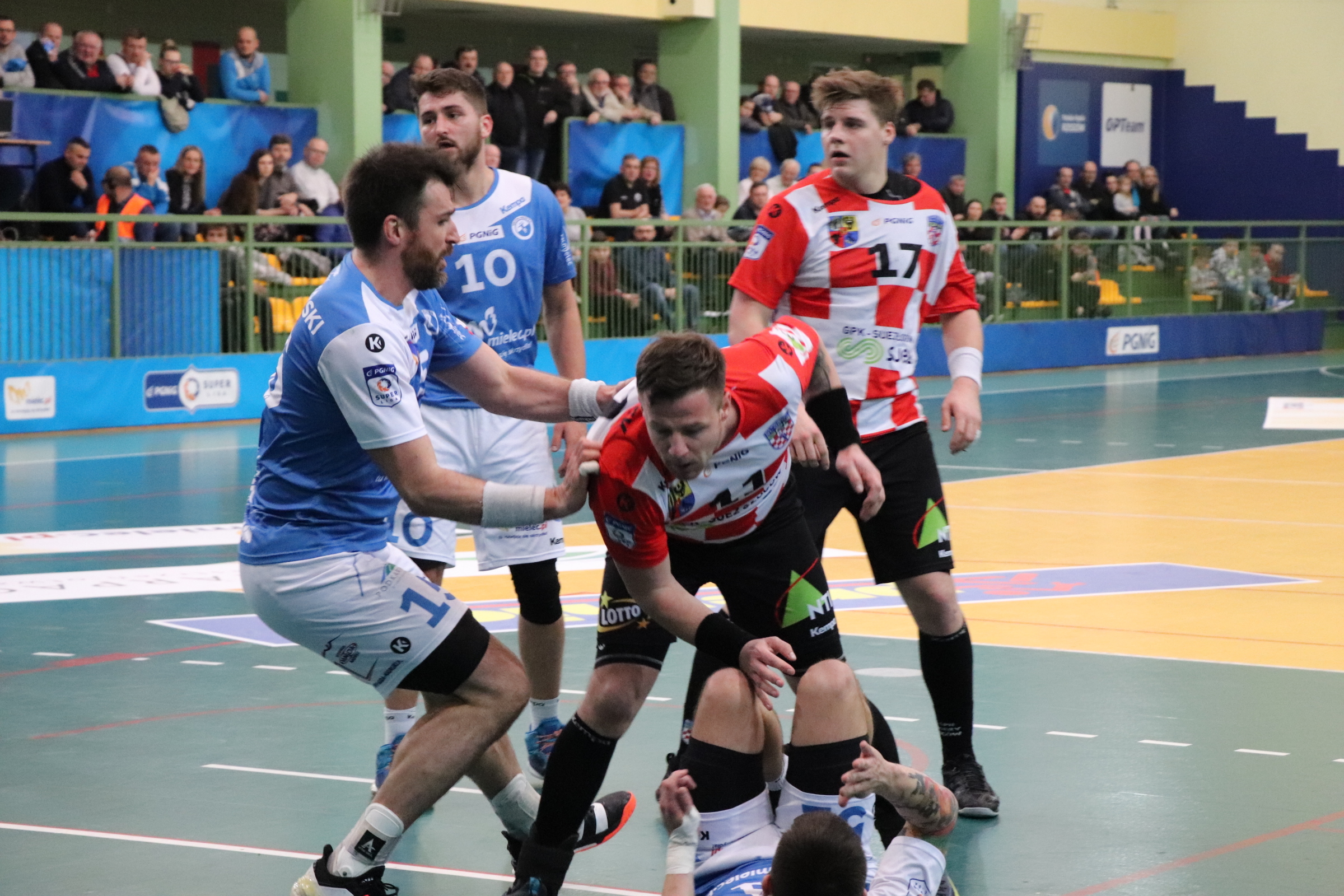 Pierwsza połowa od samego początku była niezwykle zacięta i wyrównana, choć przez dłuższy czas to mielczanie prowadzili dwoma trafieniami, co w dużej mierze zawdzięczają bardzo dobrej dyspozycji Tomasza Wiśniewskiego, który popisywał się skutecznymi interwencjami.