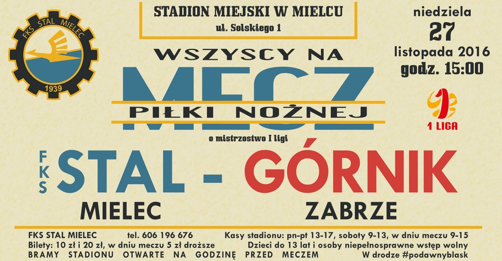 Spotkanie FKS Stal Mielec - Górnik Zabrze w niedzielę 27 listopada rozpocznie się o godzinie 15:00. Sprzedaż biletów na to spotkanie prowadzone jest w Kasach Stadionu Miejskiego w Mielcu. Grupy zorganizowane mogą awizować się poprzez kontakt z biurem Klubu.