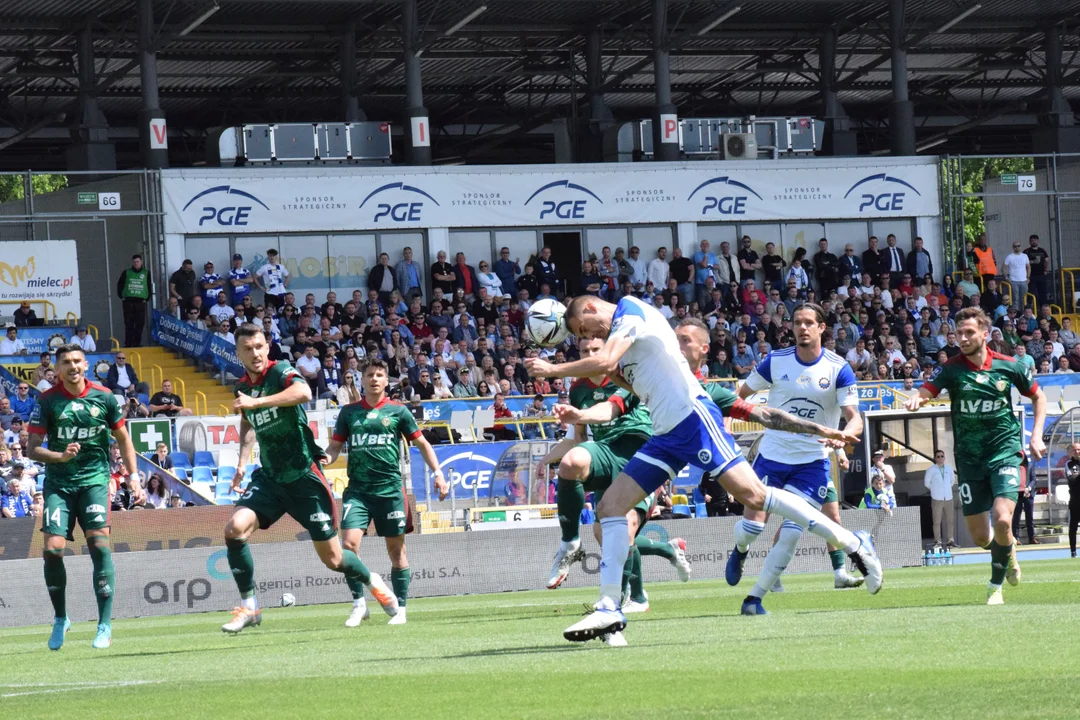 Mielecka Stal wciąż nie jest pewna ligowego bytu. Do pełni szczęścia brakuje jednego punktu. Niedzielne spotkanie rozpoczęło się dla biało-niebieskich od mocnego uderzenia. W 2 minucie Oskar Zawada zagrał do Macieja Domańskiego, a ten kropnął z całej siły, ale piłka odbiła się tylko od poprzeczki. W 16 minucie goście objęli prowadzenie. Zagranie do Dennisa Jastrzembskiego stworzyło szansę Robertowi Pichowi, który wykończył akcję. Podopieczni Adama Majewskiego rzucili się do odrabiania strat. W 29 minucie blisko szczęścia był Marcin Flis, ale Matúš Putnocký był na posterunku. Po pierwszej połowie to Śląsk był bliżej utrzymania.