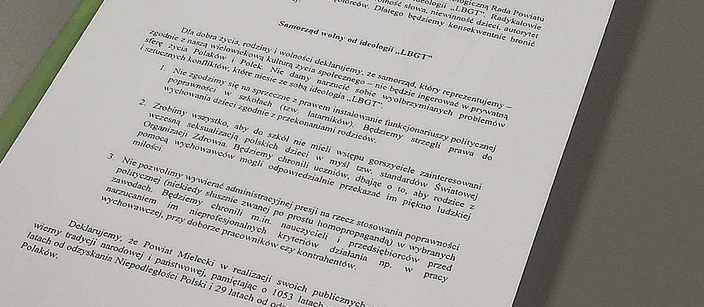 Radny Kacper Głaz przygotował projekt stanowiska Rady Powiatu Mieleckiego w którym rada powiatu nie zgadza się na "ingerencję w prywatną sferę życia Polaków i Polek. Nie damy narzucić sobie wyolbrzymianych problemów i sztucznych konfliktów, które niesie za sobą ideologia "LGBT".