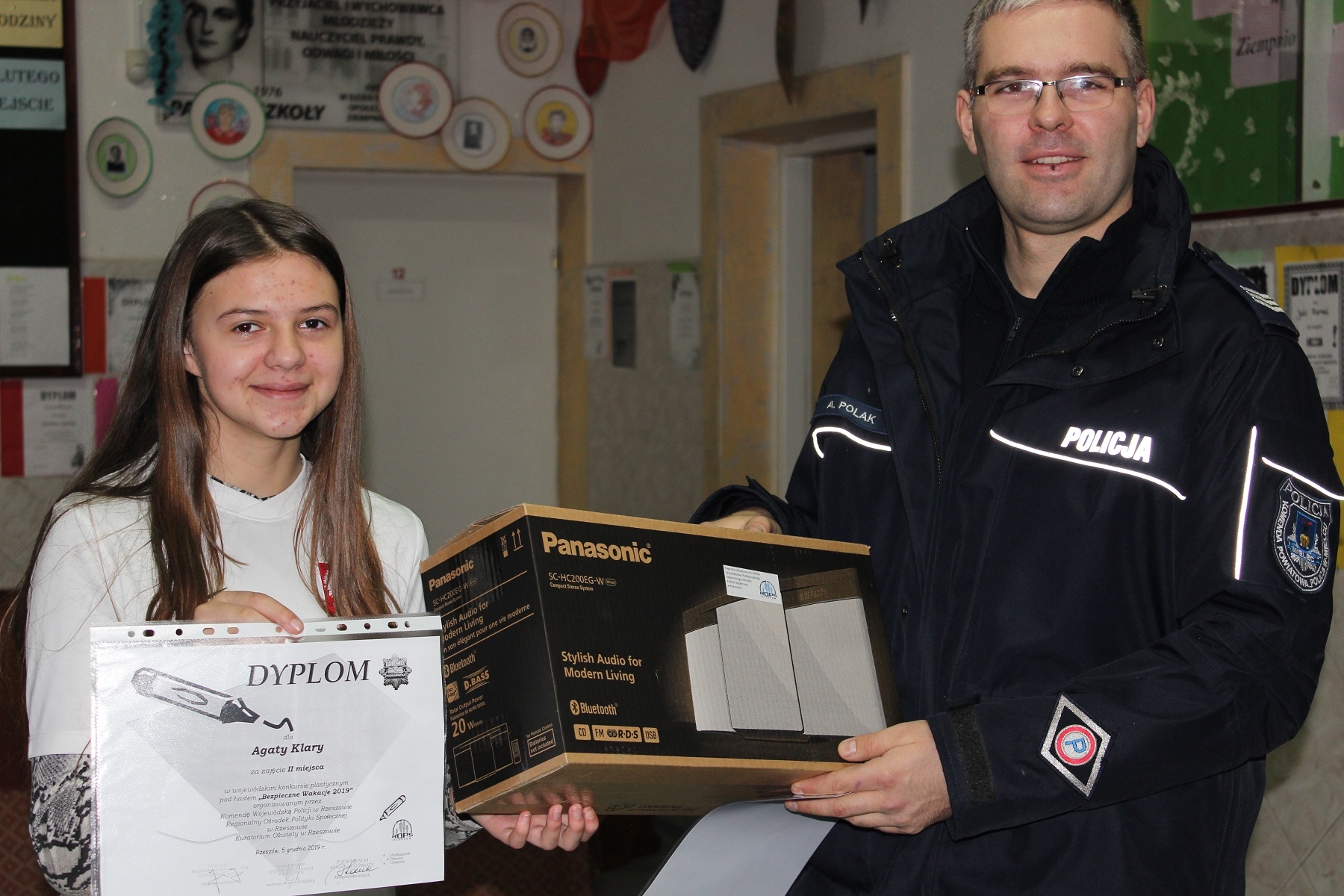 Ponieważ laureatka nie mogła osobiście uczestniczyć w uroczystości rozdania nagród w Rzeszowie, dyplom i supernagrodę dostarczył i wręczył na miejscu w szkole st. sierż. Arkadiusz Polak w styczniu w ostatnim dniu przed feriami. Konkurs został zorganizowany przez Komendę Wojewódzką Policji w Rzeszowie oraz Kuratorium Oświaty w Rzeszowie.