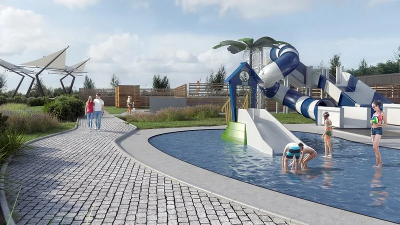 Do tego dojdzie dwie zjeżdżalnie wodne z hamowniami (szeroka i rurowa o wys. do ok. 3,5 m) i splash park z jedną małą zjeżdżalnią wodną dla dzieci w wieku 1-4 lat, stanowiący wodny plac zabaw.