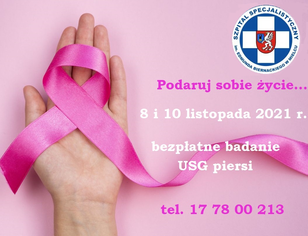 W dniach 8 i 10 listopada 2021 r. Szpital Specjalistyczny w Mielcu zaprasza na bezpłatne badanie USG piersi. Żeby wykonać bezpłatne badanie USG piersi wystarczy zapisać się pod numerem tel. 17 78 00 213. Rejestracja czynna od poniedziałku do piątku w godzinach 12.00-14.00