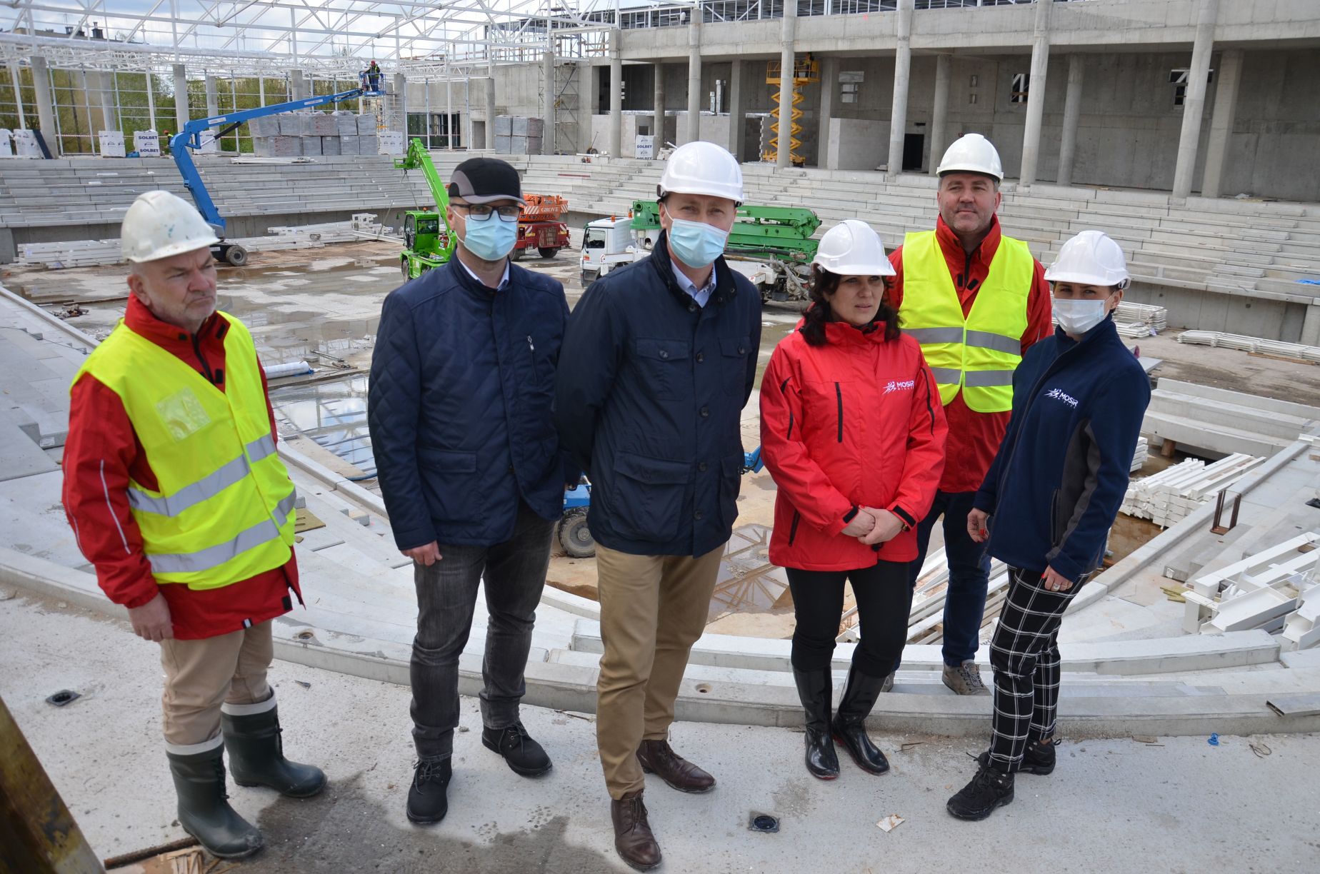 Na plac budowy hali sportowej w Mielcu wybrali się Jacek Wiśniewski – prezydent Mielca, Adriana Miłoś i Paweł Pazdan – zastępcy prezydenta Mielca, Mirosława Gorazd - dyrektor MOSiR oraz Norbert Jackowski - koordynator projektu budowy hali sportowej ze strony Urzędu Miejskiego w Mielcu, który opowiadał o technicznych aspektach inwestycji.