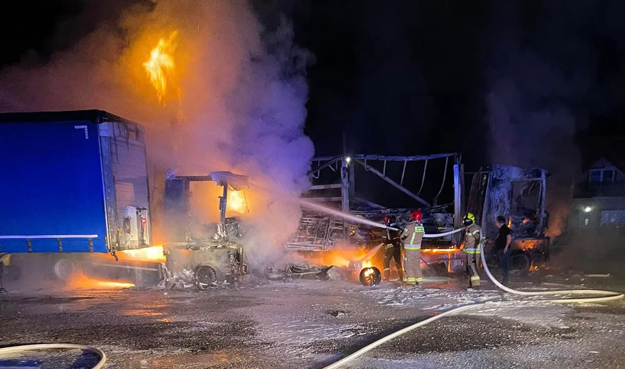 - Po przybyciu na miejsce strażacy zastali kilka płonących samochodów ciężarowych. W pierwszej kolejności strażacy zabrali się do zabezpieczenia obszaru, aby zapobiec niebezpieczeństwu eksplozji czy dalszemu rozprzestrzenianiu się ognia.