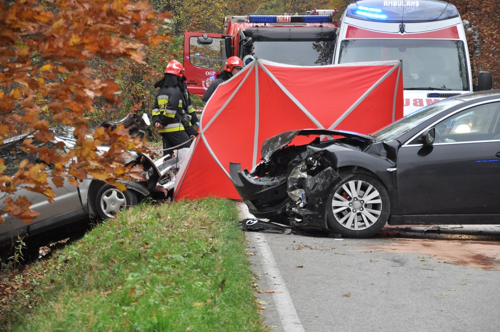 Kierujący mazdą doznał lekkich obrażeń ciała. Na miejscu pracują policjanci którzy ustalają okoliczności zdarzenia. Wkrótce zjawi się też prokurator. Droga jest nieprzejezdna.