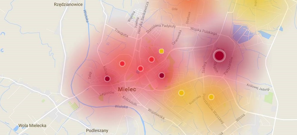 Zgodnie z mapą czujników, które mierzą czystość powietrza w mieście, największy problem z przydomowymi piecami w Mielcu mamy na osiedlach: Wolności, Dziubków, Lotników i w rejonie starego miasta.