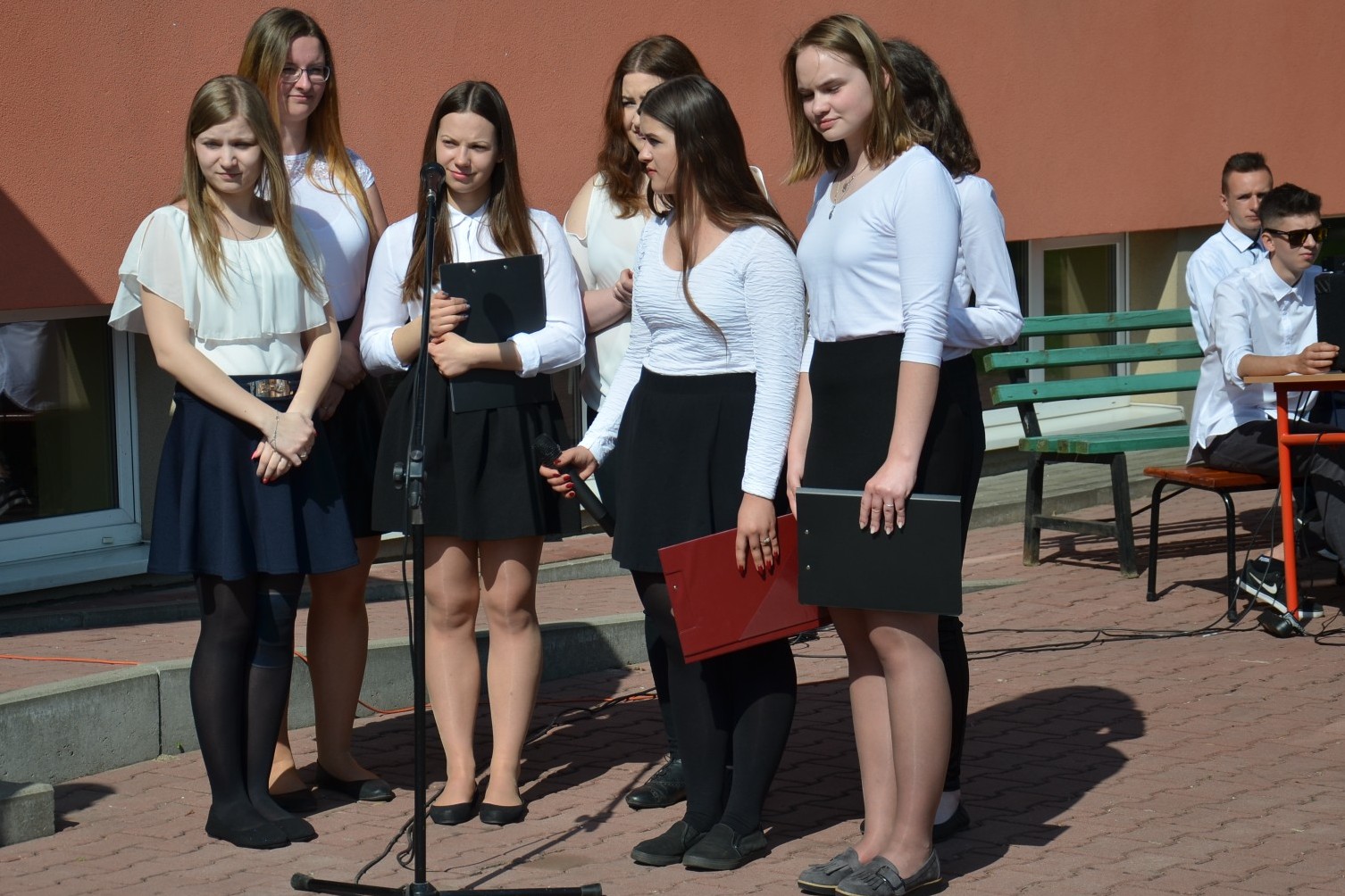 Młodzież na szkolnym dziedzińcu zaprezentowała ciekawy występ artystyczny o swoim patronie szkoły.