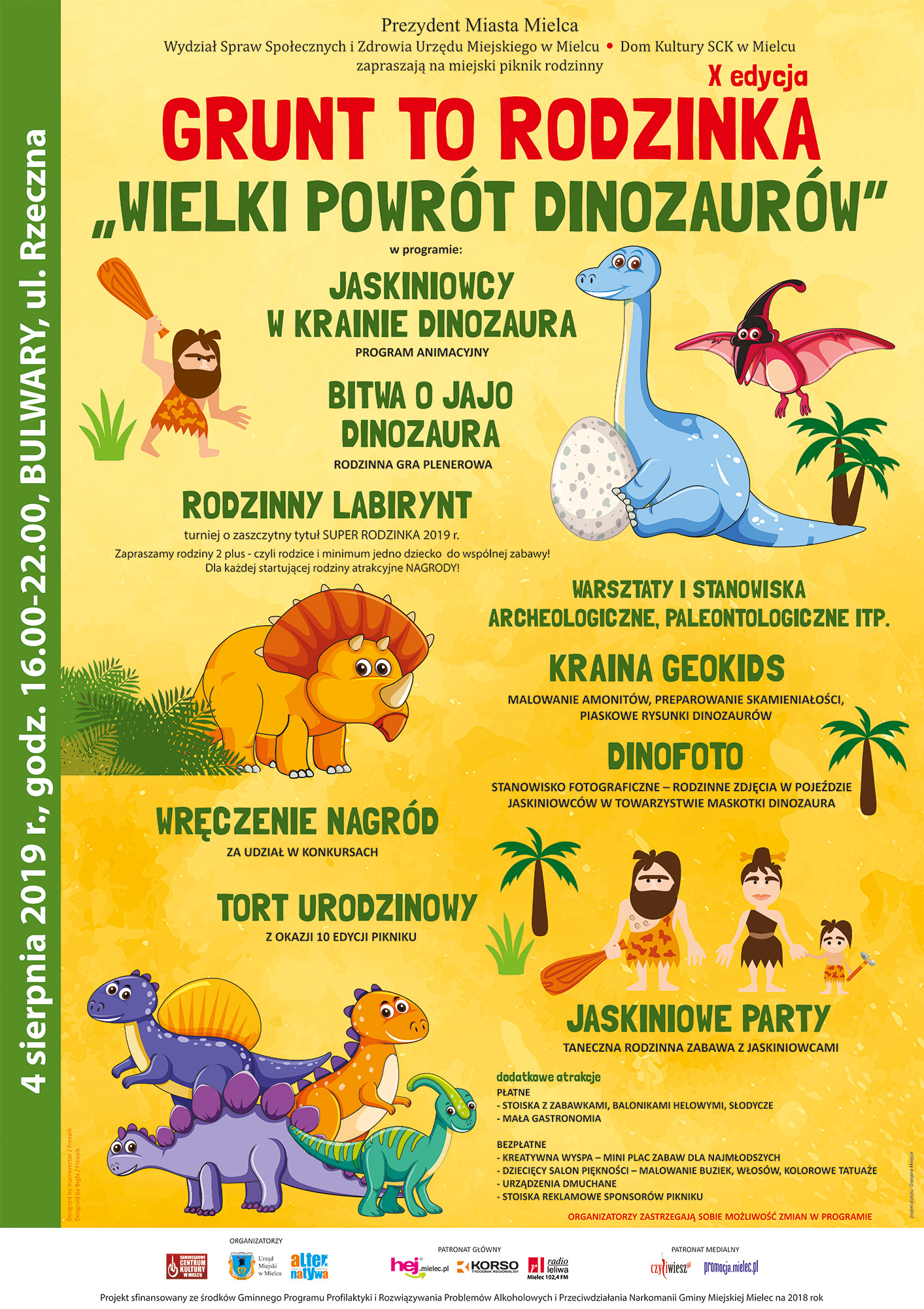 Dinozaury powracają! Stworzenia te wciąż fascynują dużych i małych. W trakcie wspólnej zabawy będzie okazja, by dowiedzieć się, czym były, jak żyły i jak wyginęły dinozaury. Następnie mali i duzi wcielą się w skład zespołu badawczego i poznają wszystkie tajniki pracy Paleontologa; nauczą się preparować skamieliny w poszukiwaniu ukrytych śladów dawnego życia, pomalują gipsowe figurki dinozaurów, amonitów i znanego wszystkim mamuta „Mańka”, a na koniec przystąpią do rywalizacji w wielkiej bitwie o Jajo Dinozaura..