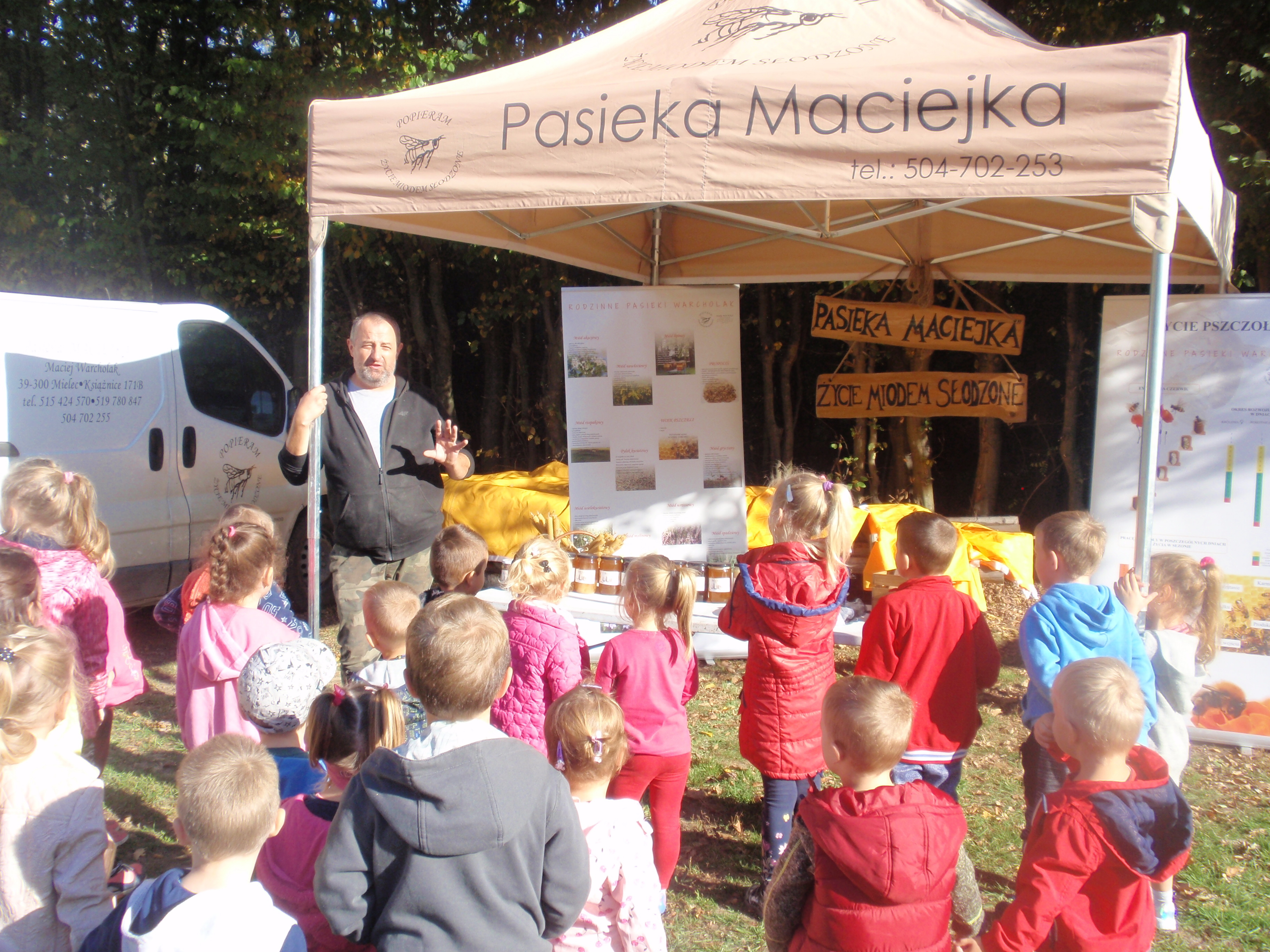 Maciej Warcholak [Pasieka Maciejka] przedstawił biologię pszczół, organizację pracy w ulu oraz poprowadził warsztaty pszczelarskie ze stałym elementem degustacji miodu.