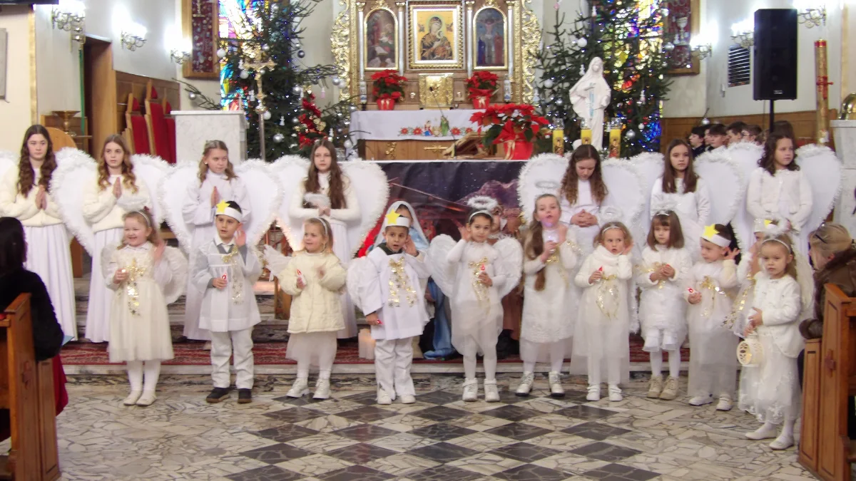 Uroczystość rozpoczęła się w miejscowym kościele parafialnym, gdzie zgromadzeni goście mogli obejrzeć wzruszające przedstawienie jasełkowe. Uczniowie zaprezentowali tradycyjne kolędy i pastorałki, a dziewczęta z klasy piątej w strojach aniołów wykonały piękny taniec przed szopką. Szczególny zachwyt wzbudzili pasterze i pasterki – najmłodsi uczniowie z klas I, II i III, którzy zaprezentowali góralską pastorałkę oraz żywiołowy taniec z ciupagami.