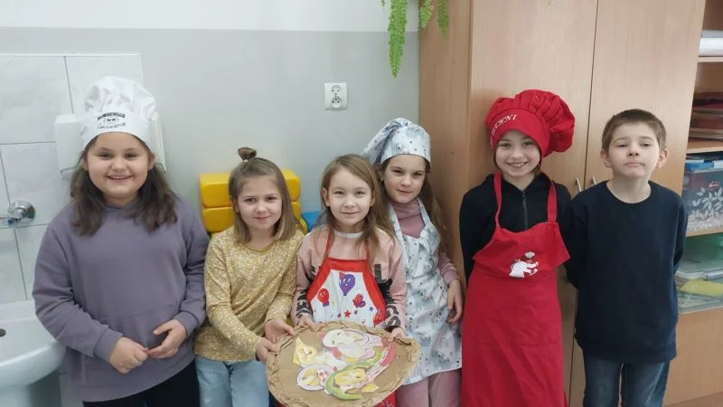 Nasi uczniowie przebrani za ,,prawdziwych kucharzy” z uśmiechem przyjmowali zamówienia i wykonywali ulubione pizze swoich kolegów, żałowali, że tylko z papieru. Uczniowie z klas I -III chętnie włączyli się do konkursu ,,My pizza is the best” i przygotowali swoje najsmaczniejsze pizze z kartonu, plasteliny, masy solnej i z materiału, na których nie zabrakło cheese, tomatoes, corn, mushrooms, onions, ham.