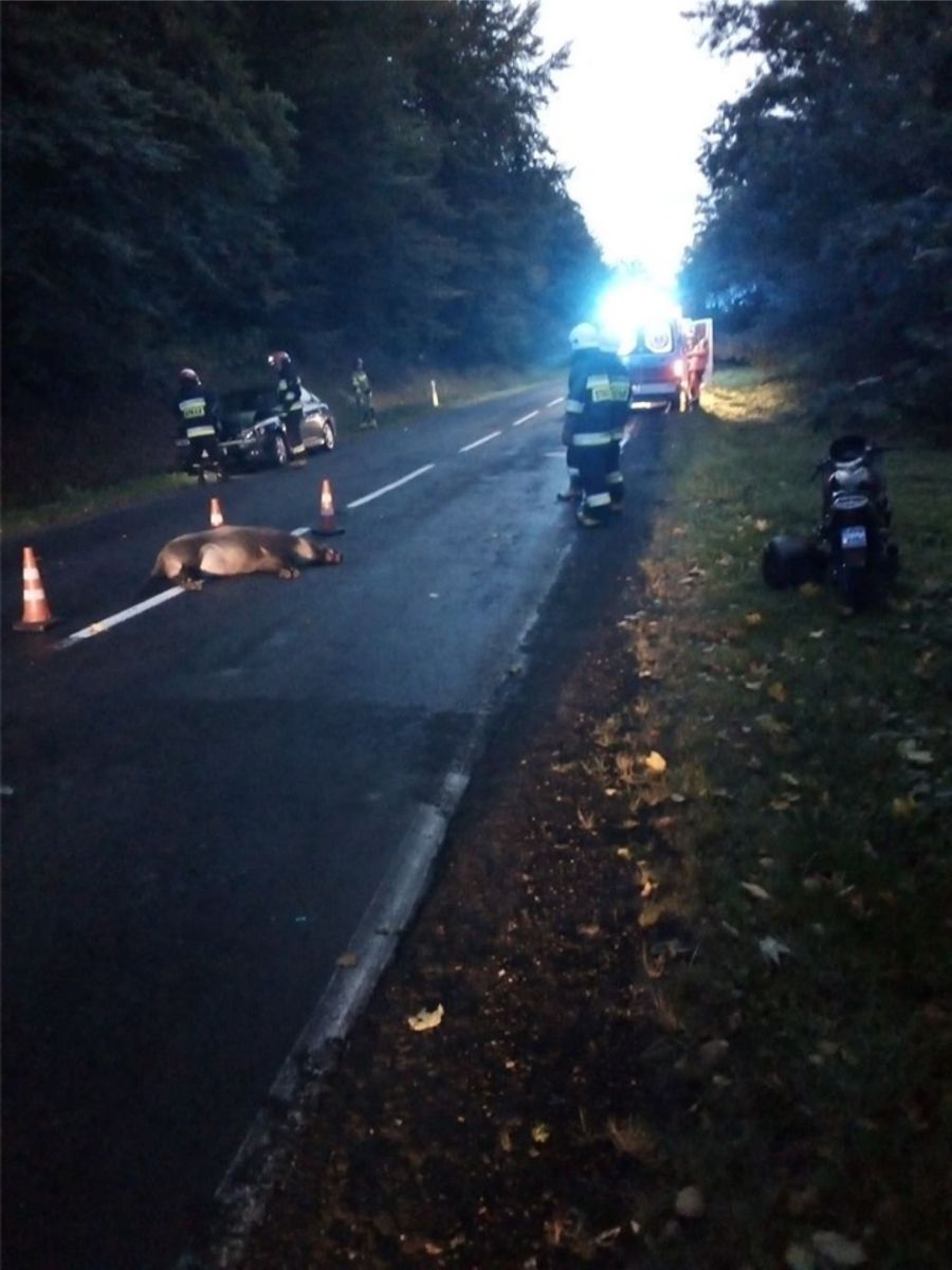 Jadący za nim na motorze mężczyzna nie zdążył zareagować i najechał na leżącego na jezdni dzika.