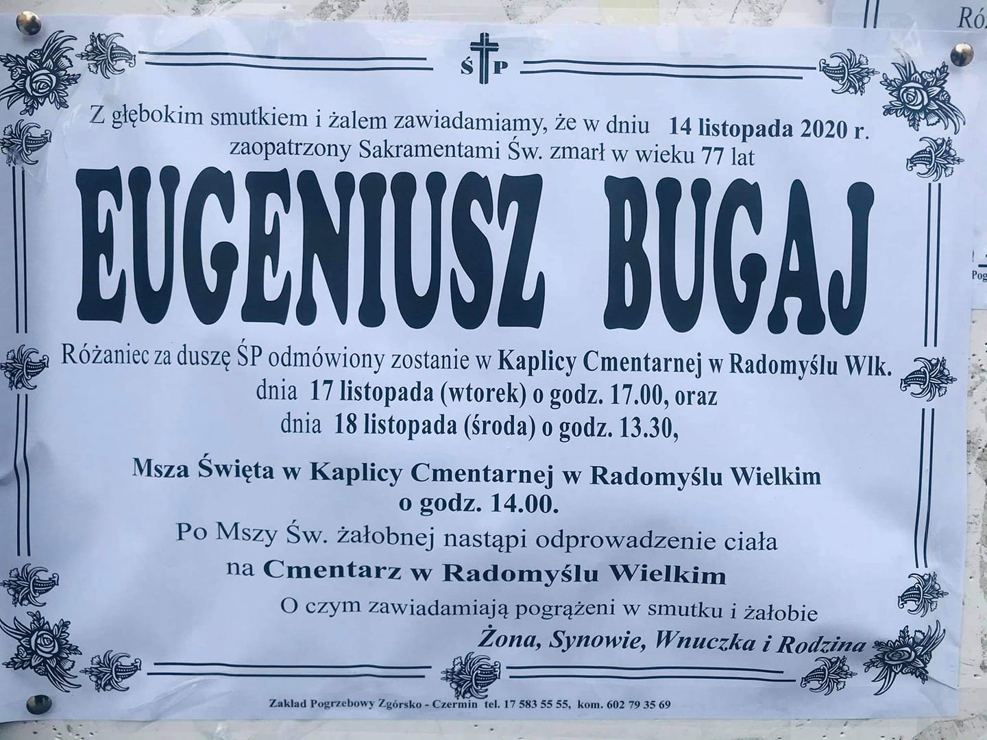 Msza święta pogrzebowa odbędzie się dnia 18 listopada o godzinie 14:00 w Kaplicy Cmentarnej w Radomyślu Wielkim.