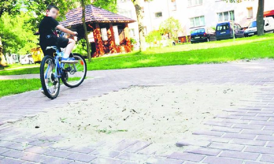 Na razie zamiast miejsca, w którym dzieci mogłyby się między blokami bawić, jest jedynie kawałek wybrukowanego placu z dziurą w ziemi, w której znajduje się piasek.