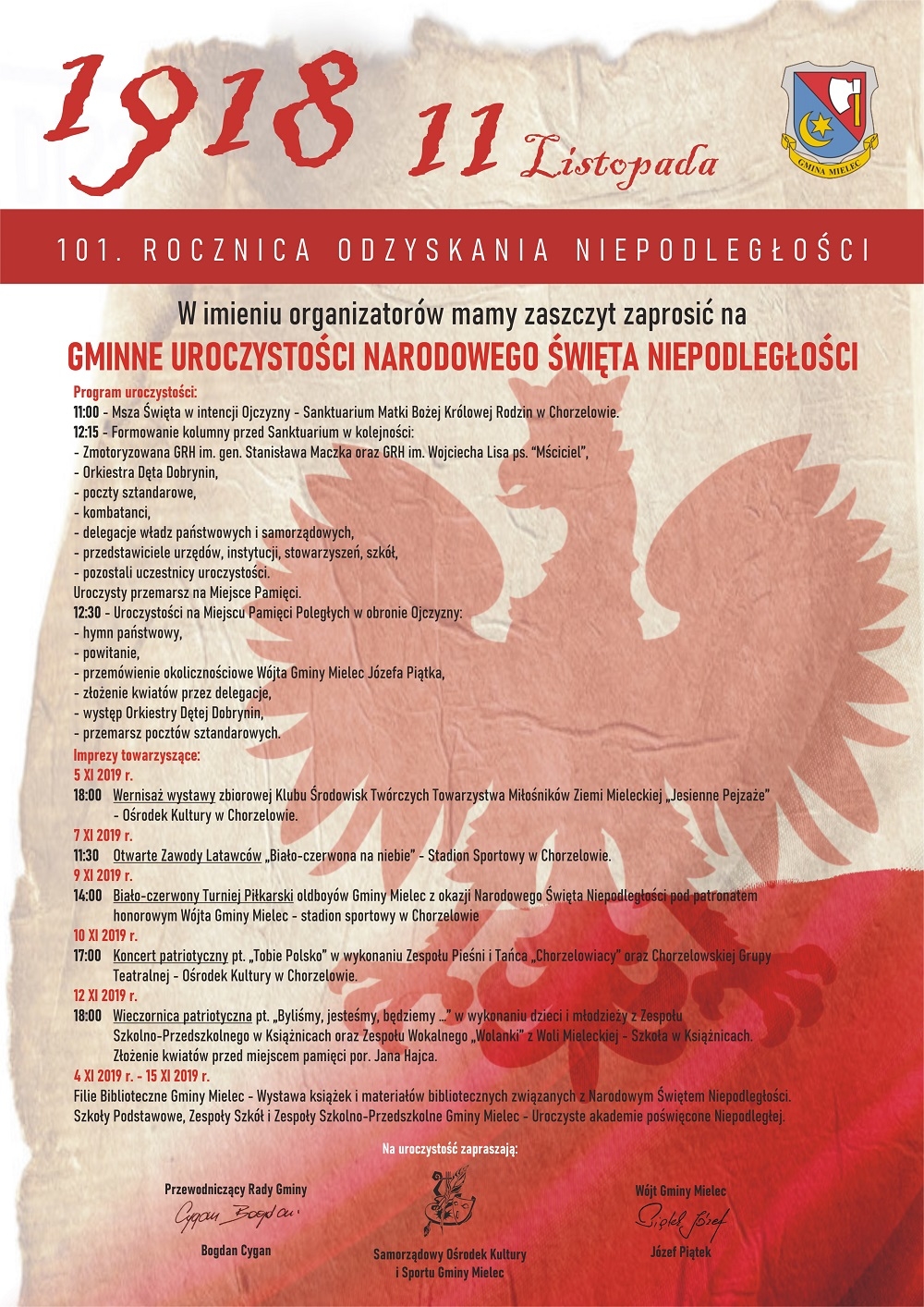 Ponadto w ramach 101. Rocznicy odzyskania przez Polskę Niepodległości w Szkołach Gminy Mielec odbędą się uroczyste akademie oraz wydarzenia o charakterze patriotycznym, a Biblioteki Publiczne przygotują specjalne wystawy poświęcone Ojczyźnie.